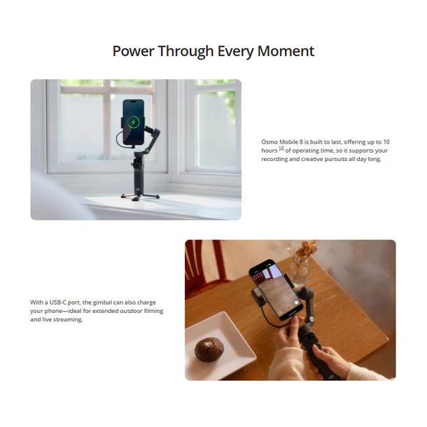 A more flexible gimbal offers more possibilities. Osmo Mobile 8’s pan axis supports unlimited 360° horizontal rotation, giving you the freedom to capture smooth panoramic photos and videos from any angle. Combined with intelligent tracking, the gimbal can continuously lock onto moving subjects, delivering seamless, professional-looking footage.
