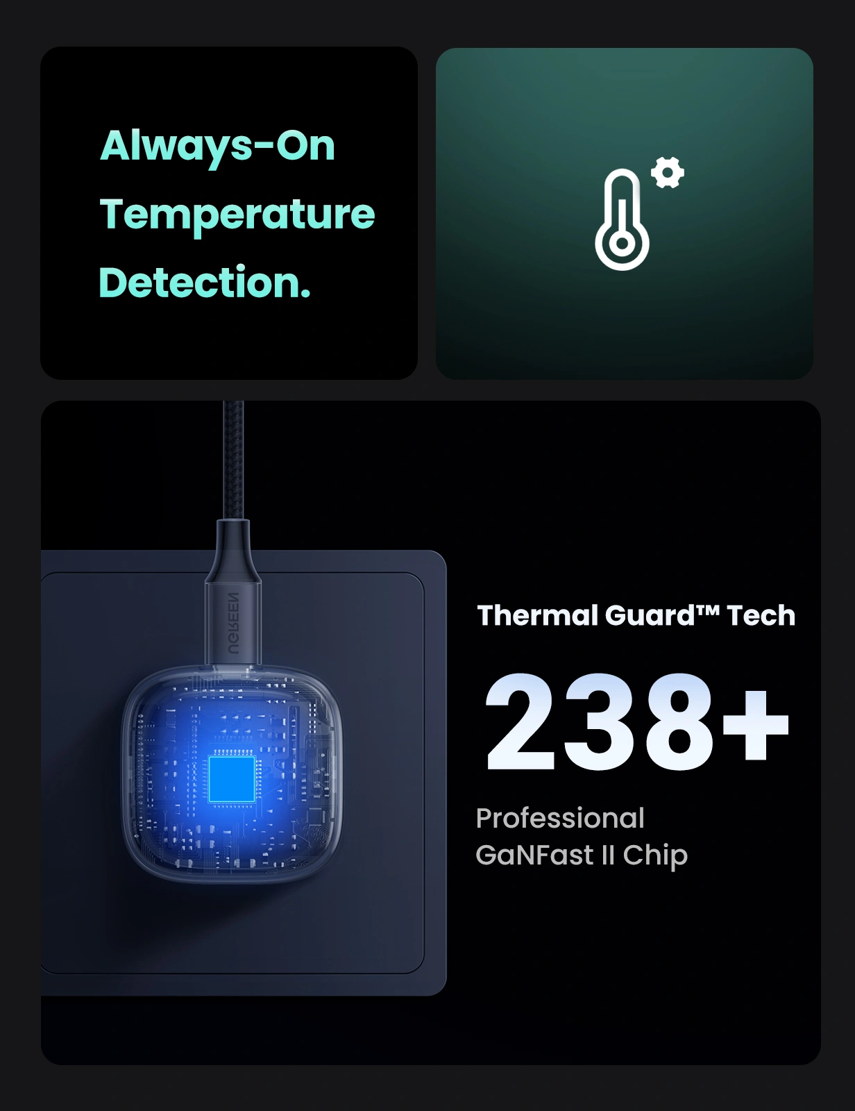 - Advanced Thermal Guard technology monitors the temperature in real-time, protecting devices from overheating, over-voltage, and short circuits.