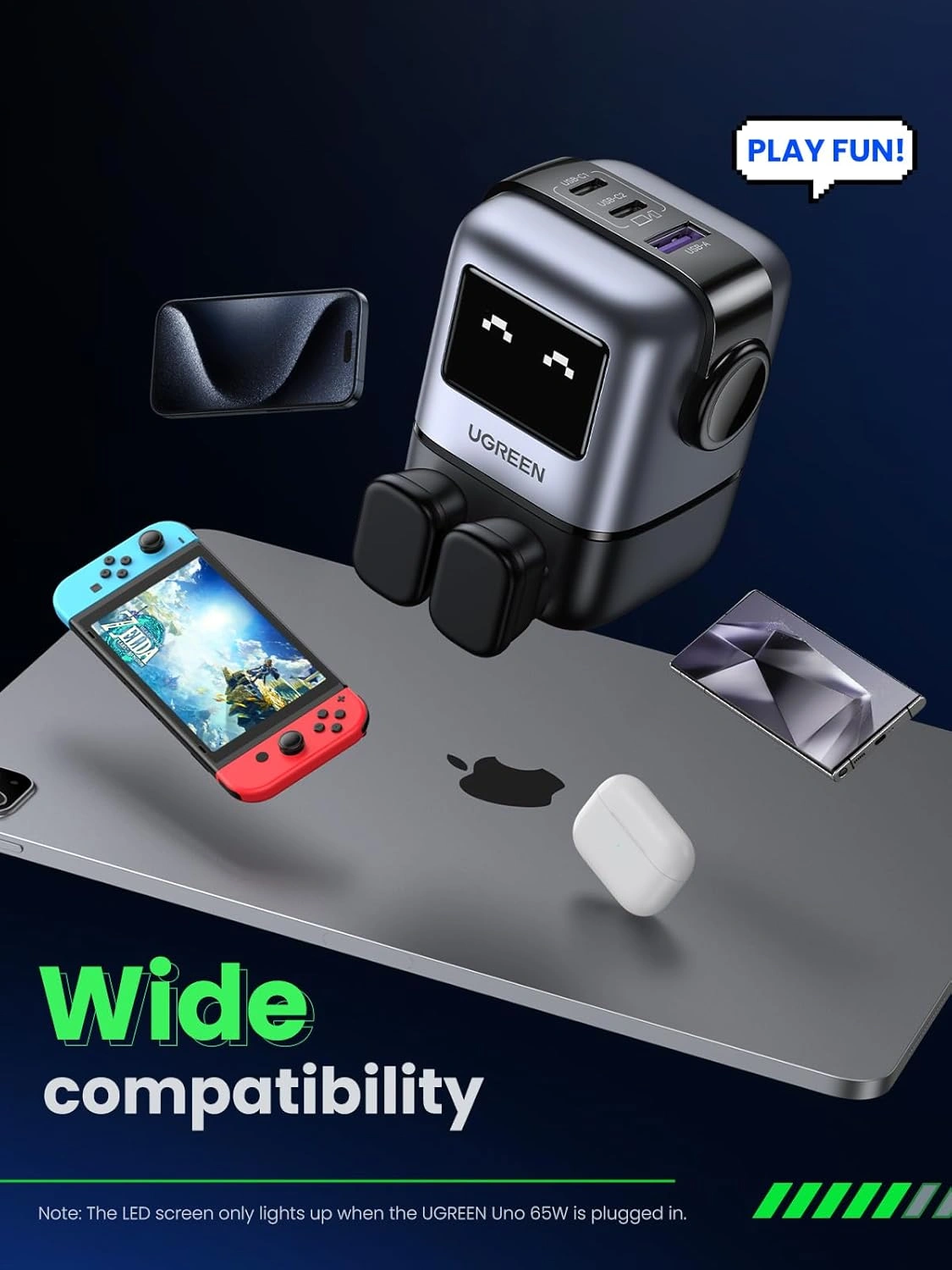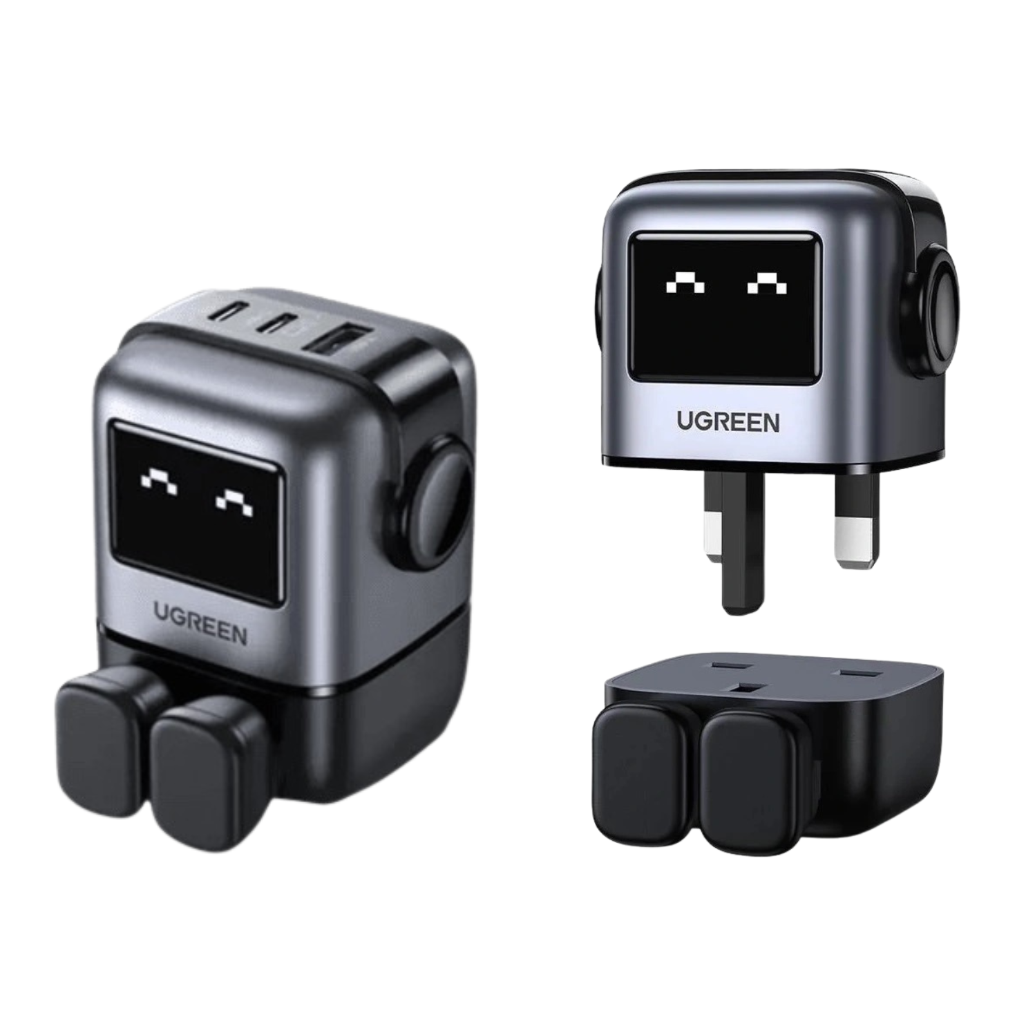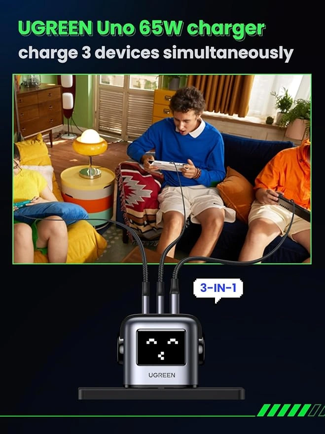 The UGREEN 65W UNO RG GaN Fast Charging Adapter – 25686 combines powerful fast charging with a fun, interactive robot-inspired design. Featuring an expressive LED face that reacts in real time to charging status, this charger delivers both performance and personality. Powered by advanced GaN technology, it ensures efficient, safe, and ultra-fast charging for laptops, tablets, and smartphones.
