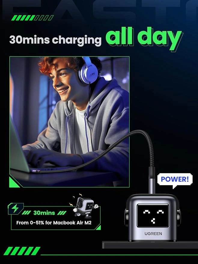 Delivers up to 65W max output, capable of charging a MacBook Air M2 up to 51% in just 30 minutes (UGREEN lab data).
